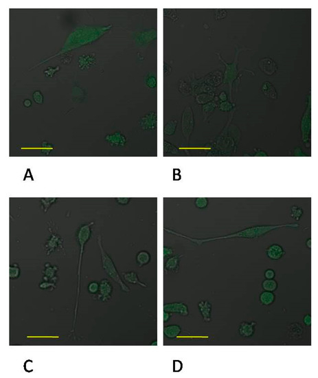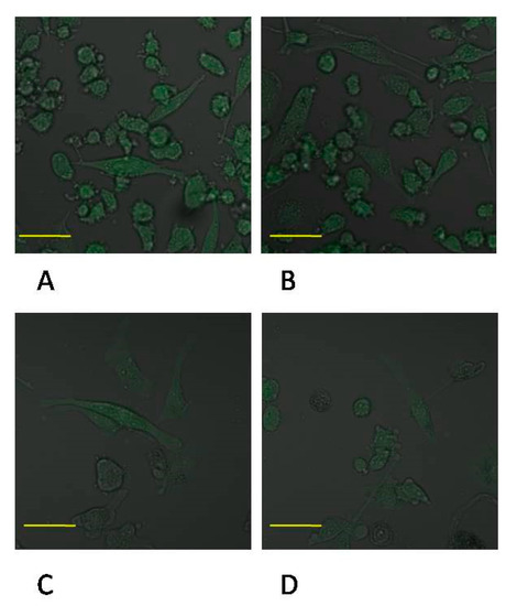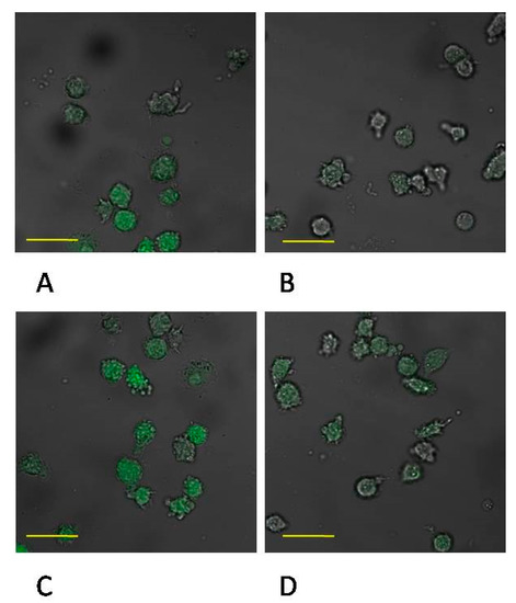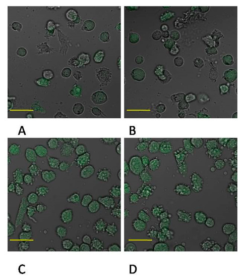 Imaging of MMP-2 enzyme expression by fluorescence microscopy in macrophages cultured with mineral trioxide aggregate (MTA Repair HP). Cells were cultured in RPMI medium with 10% FBS—control conditions for 24 h (A) and for control conditions for 48 h (B); THP1-monocytes cultured in RPMI medium with 10% FBS with MTA Repair HP for 24 h (C) and for 48 h (D). Immunofluorescence was performed with the use of specific primary antibody, mouse anti-MMP-2 (overnight incubation at 4 °C) and secondary antibodies conjugated with fluorochrome—anti-mouse IgG-FITC (incubation for 45 min at room temperature), MMP-2 expression is indicated by the visible green fluorescence. Image analysis was performed using a confocal microscope with 38 HE GFP filters for green fluorescence. The control cells were incubated in 10% FBS RPMI medium as control 24 (C 24) for 24 h for 48 h as control 48 (C 48). The experiments were conducted as six separate assays (each assay in three replicates). There were no differences in enzymes protein expression (p ≤ 0.5, U Mann–Whitney test) examined by measuring the intensity of fluorescence through a plate reader (data not shown). Scale bar 40 μm.