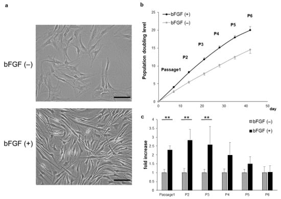 Effect of bFGF on cell proliferation and morphology. (a) The morphology of SMSCs was observed under a light microscope at passage 3 (bar = 100 µm). (b) Population doubling level of SMSCs (patients #1 to #5). (c) Cell counts of SMSCs in the bFGF (+) group at each passage relative to those of the bFGF (−) group (patients #1 to #5). ** p < 0.01. bFGF, basic fibroblast growth factor; SMSCs, synovial mesenchymal stem cells.