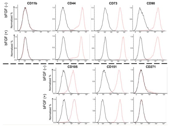 To evaluate the effects of bFGF on the expression of cell surface markers in SMSCs, fluorescence-activated cell sorting (FACS) was conducted for four mesenchymal surface markers (CD44, CD73, CD90, and CD105), two mesenchymal negative markers (CD11b, CD271), and one chondrocyte surface marker (CD151) (Figure 3). Almost 100% of the SMSCs expressed all four mesenchymal surface markers and one chondrocyte marker, and almost none of SMSCs expressed mesenchymal negative markers. Moreover, their expression levels were not affected by bFGF.