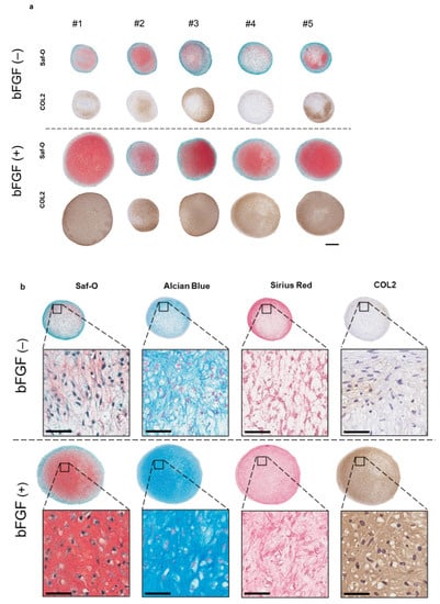 To assess the effect of the addition of bFGF in the cell-proliferation phase on cartilaginous tissue formation, a 3D pellet culture was established. After four weeks of chondrogenic induction, histology, the expression of cartilage differentiation-related genes, and extracellular matrix (ECM) production, were evaluated. Synovial pellets of the bFGF (+) group grew larger and were more strongly stained with Safranin-O (Saf-O) and immunostained for collagen type II (COL2) than those of the bFGF (−) group (n = 5 per group) (Figure 4a). A similar tendency was observed in all patients. Moreover, pellets of the bFGF (+) group showed hyaline cartilage-like differentiation with chondrocyte-like round-shaped cells in the lacuna, abundant collagen stained with Sirius Red and abundant ECM stained with Saf-O and Alcian Blue (Figure 4b).