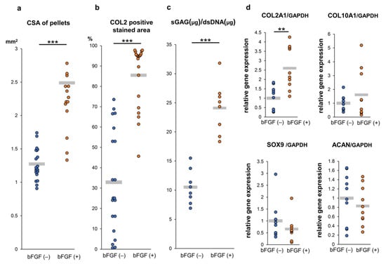 For three-dimensional pellet culture, 2 × 105 cells harvested from passage 3 were centrifuged in 96 deep-well polypropylene plates (Evergreen Scientific, Vernon, CA, USA) and cultured in GM (Figure 8c). The next day, the medium was changed to 0.5 mL of chondrogenic basal medium (high-glucose DMEM (Gibco), 110 µg/mL sodium pyruvate (Gibco), 1% ITS + premix (Corning Incorporated, NY, USA), 50 µg/mL ascorbic acid-2-phosphate (Sigma-Aldrich), 40 µg/mL l-proline (Wako, Osaka, Japan), and 1% antibiotic–antimitotic) supplemented with 50 ng/mL BMP2 (Medtronic, Dublin, Ireland) [50], and 10 ng/mL TGF-β3 (Peprotech, Rocky Hill, NJ, USA). The medium was replaced twice per week and cells were maintained at 37 °C with humidified 5% CO2. The synovial pellets were cultured in chondrogenic basal medium for 4 weeks to induce chondrogenic differentiation and used in experiments (histological analysis, qRT-PCR analysis, and sGAG evaluation) (Figure 8d). The effects of bFGF on the expression of cartilage differentiation-related genes (COL2A1, COL10A1, SOX9, and ACAN) were analyzed by qRT-PCR. The total RNA of pellets was extracted using a Direct-ZolTM RNA kit (Zymo Research, Irvine, CA, USA) and reverse transcribed into complementary DNA using the ReverTra Ace® qPCR RT Master Mix (TOYOBO, Osaka, Japan), according to the manufacturer’s protocol. qRT-PCR was performed as described previously [51]. The transcriptional levels of target genes were normalized to the level of glyceraldehyde 3-phosphate dehydrogenase (GAPDH) gene expression. The expression levels of each target gene were calculated using the 2–ΔCt method [51]. The TaqMan assays were performed as follows: COL2A1, Hs00264051_m1; COL10A1, Hs00166657_m1; ACAN, Hs00153936_m1; SOX9, Hs01001343_g1; and GAPDH, Hs02758991_g1. sGAG in the pellets was measured using the Blyscan Glycosaminoglycan Assay Kit (Biocolor, Westbury, NY, USA) after lysis with papain. sGAG production was normalized to the double-stranded DNA (dsDNA) content, which was measured on a Qubit 3.0 Fluorometer (Thermo Fisher Scientific, Waltham, MA, USA) using a QubitTM dsDNA HS Assay Kit (Thermo Fisher Scientific).