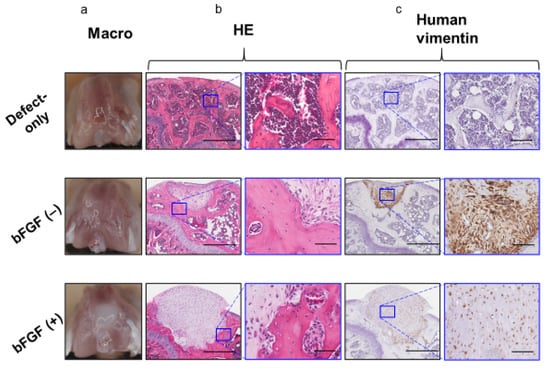 However, the defects of the subchondral bone region were filled with repaired bone in the defect-only group. Human-vimentin-positive cells were found in the pellet implantation site in both the bFGF (−) and bFGF (+) groups, suggesting the existence of implanted human SMSCs (Figure 6c).