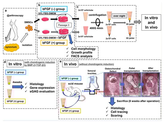 Schematic diagram of the study design. (a) SMSCs were isolated from the synovium obtained from human knee joints. (b) SMSCs were separated into the bFGF (−) and bFGF (+) groups. (c) For 3D pellet culture and transplantation, SMSCs harvested from passage 3 were aggregated by centrifugation. (d) In vitro, the pellets were cultured for 4 weeks in chondrogenic basal medium with BMP2 (50 ng/mL) and TGF-β3 (10 ng/mL), to induce chondrogenic differentiation. The histology of pellets, the expression of cartilage-differentiation-related genes, and ECM production were evaluated. (e) In vivo, osteochondral defects (the black dotted line in the left picture) were created in the femoral trochlea of scid mice. Synovial pellets from both groups were implanted into each knee (the black dotted line in the middle and right pictures), followed by histological evaluation (including cell tracing and scoring) 8 weeks after the operation. SMSCs, synovial mesenchymal stem cells; bFGF, basic fibroblast growth factor; 3D, three-dimensional; FBS, fetal bovine serum; DMEM, Dulbecco’s modified Eagle medium; FACS, fluorescence-activated cell sorting; BMP2, bone morphogenetic protein-2; TGF-β3, transforming growth factor-β3; ECM, extracellular matrix; sGAG, sulfated glycosaminoglycan; scid, severe combined immunodeficiency.