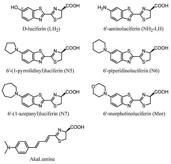 All the 6′-substituted amino luciferin analogs (Figure 1) were synthetized as previously reported [33]. Stock solutions of 10 mM were prepared in DMSO and kept at −20 °C in the dark.
