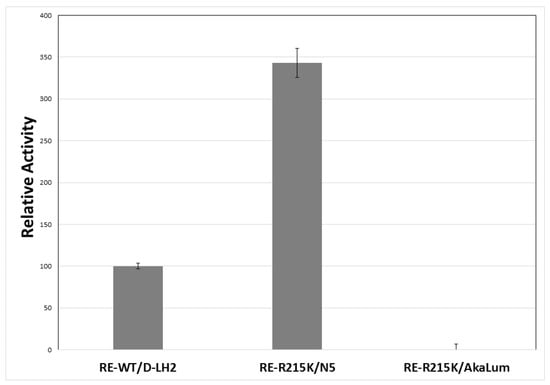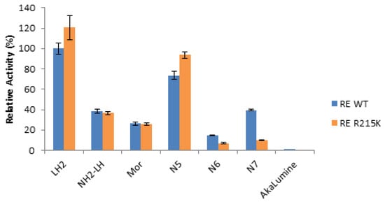 Comparison of the bioluminescence activity of P. hirtus wild-type (RE-WT) and R215K mutant luciferases with 100 µM d-luciferin (d-LH2), 6′-(1-pyrrolidinyl)luciferin (N5) and commercial AkaLumine (AkaLum). The results were normalized for P. hirtus wild-type luciferase activity with LH2. The standard deviations of activity averaged 3.15% and ranged from 0.3% to 11.9%.