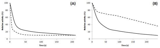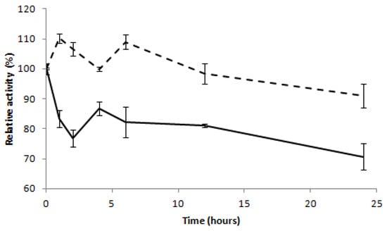 Thermostability of Phrixotrix hirtus red emitting luciferase (bold line) and its R215K mutant (dashed line). The standard deviations of activity averaged 2.4% and ranged from 0.3% to 5%.