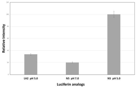 In order to check the cell membrane penetrability and in vivo luminescence properties of such analogs, we tested the in vivo BL activity of E. coli liquid cultures after mixing LH2 and the N5 at neutral and acidic (pH = 5.0) pH (Figure 8). At 1 mM concentration and at pH~7.0, when the membrane permeability is expected to be lower due to the ionized substrate carboxyl group, N5 gave almost the same in vivo bioluminescence activity of LH2 at pH 5.0. However, when provided at pH 5.0, N5 showed about three times higher bioluminescent activity than LH2 at the same pH and concentration. These results show that N5 has much better penetrability across the biological membranes, and therefore is a better substrate for bioimaging. Additionally, the in vivo bacterial bioluminescence with N5 showed a more sustained kinetics, with a half-life of 33 min, in relation to LH2 which showed a half-life of 20 min (Figure S1 Supplemental information).