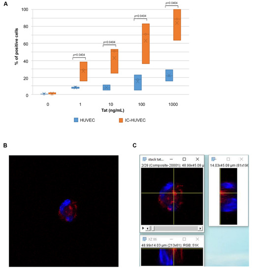 Extracellular Tat protein is efficiently taken up by activated endothelial cells. In (A) human umbilical vein endothelial cells (HUVEC, blue plots) or inflammatory cytokine (IC)-activated (IC-HUVEC (orange plots) were incubated for 10 min in medium containing serial concentrations (1–1000 ng/mL) of biologically active Tat or its suspension buffer (PBS-0.1% BSA). Intracellular Tat content was evaluated by flow cytometry after staining with affinity-purified rabbit anti-Tat polyclonal Ab (or isotype control), as described in Section 4 Materials and Methods. Non-permeabilized cells were employed as an additional control. Results are expressed as the percentage of positive cells, as compared to isotype-stained samples. Box-plot of data obtained from three independent experiments and analyzed by the Mann–Whitney nonparametric test are shown. Dots indicate individual measures. In (B,C), IC-HUVEC were incubated with rhodamine-labeled Tat (100 ng/mL) and treated as described in Section 4 Materials and Methods. Images are optical sections (optical thickness = 0.40 μm) collected from a confocal microscope showing cellular internalization of Tat (red). Blue indicates nuclei stained with DAPI. Scale bar = 15 μm.