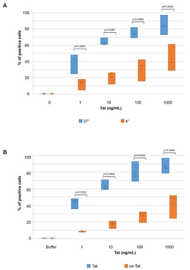 Entry of Tat in IC-HUVEC is reduced by low temperatures or Tat oxidation. (A) IC-activated HUVEC were incubated for 10 min at 37 °C (blue plots) or 4 °C (orange plots) with biologically active Tat (1–1000 ng/mL) or its buffer (0 ng/mL). (B) IC-HUVEC were incubated for 10 min with 1–1000 ng/mL of biologically active (blue plots) or inactive, oxidized (orange plots) Tat. For both (A,B), the detection of intracellular Tat was performed as described in the legend to Figure 1, and the results are expressed as the percentage of positive cells. Box-plot of data obtained from three independent experiments and analyzed by the Mann–Whitney test are shown. Dots indicate individual measures. In all experiments, the fluorescence of permeabilized cells stained with anti-Tat Ab was compared to that of isotype-stained samples and non-permeabilized cells.