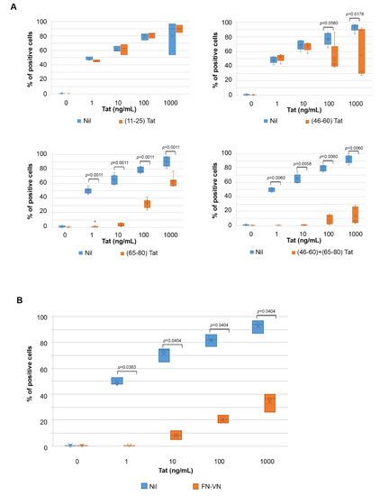Role of Tat arginine-glycine-aspartic acid (RGD) and basic region in entry of Tat in IC-HUVEC, and entry blockade by fibronectin and vitronectin. In (A), IC-HUVEC were incubated for 2 h with 100 μg/mL of the (11–25) Tat-ACIDIC (upper left panel), (46–60) Tat-BASIC (upper right panel), (66–80) Tat-RGD (lower left panel) or combined (46–60) Tat and (66–80) Tat (lower right panel) peptides. Cells incubated with the peptide suspension buffer (PBS-0.1% BSA) were employed as controls. In (B), IC-HUVEC were incubated for 2 h with fibronectin (FN) and vitronectin (VN), combined at 50 μg/mL each. FN and VN dilution buffer (PBS-0.1% BSA) served as a negative control (Nil). For both (A,B), after pre-incubation, IC-HUVEC were exposed for 10 min to biologically active Tat (1–1000 ng/mL) or its suspension buffer (Nil). Intracellular Tat content was assessed by intracellular staining and flow cytometry as described in the legend to Figure 1. Results are expressed as the percentage of positive cells as compared to isotype-stained samples and non-permeabilized cells. Box-plot data obtained from three to six independent experiments and analyzed by the Mann–Whitney test are shown. Dots in box-plots indicate individual measures. Orange plots refer to IC-HUVEC incubated with Tat peptides (A) or combined FN and VN (B); blue plots refer to control IC-HUVEC.