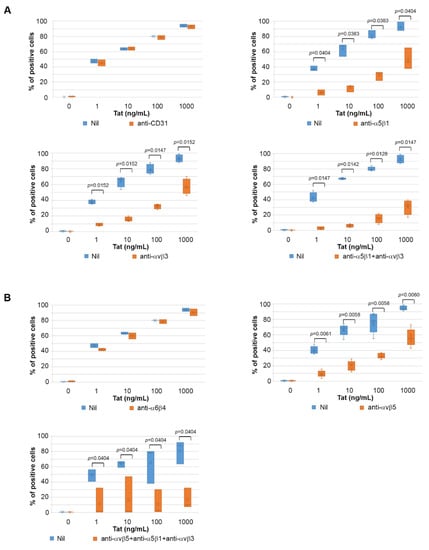 Blockade of Tat entry in IC-HUVEC by antibodies directed against the α5β1, αvβ3, and/or αvβ5 integrin. In (A), activated HUVEC were suspended and then incubated for 2 h with 5 μg/mL of monoclonal antibodies (mAb) directed against CD31 (upper left panel), α5β1 (upper right panel), or αvβ3 (lower left panel), or with anti-α5β1 and anti-αvβ3 mAb, combined together at 5 μg/mL each (lower right panel). In (B), IC-HUVEC were suspended and then incubated for 2 h with 5 μg/mL of anti-α6β4 mAb (upper left panel), or with 5 μg/mL of anti-αvβ5 mAb, alone (upper right panel) or combined with anti-α5β1 and anti-αvβ3 mAb (lower panel). For both (A,B), IC-HUVEC incubated with Ab dilution buffer (PBS-0.1% BSA) were employed as controls (Nil). After incubation, IC-HUVEC was exposed for 10 min to biologically active Tat (1–1000 ng/mL) or its buffer. Intracellular Tat content was assayed by intracellular staining and flow cytometry as described. Results are expressed as the percentage of positive cells as compared to isotype-stained samples and non-permeabilized cells. Box-plot data obtained from three to four independent experiments and analyzed by the Mann–Whitney test are shown. Dots indicate individual measures. Orange plots refer to IC-HUVEC incubated with the said mAbs; blue plots refer to control IC-HUVEC.