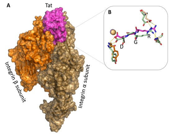 To gain more insights into the Tat binding to integrins, structural models of the interaction between Tat and αvβ3 were generated using the X-ray structure of the integrin αvβ3 in complex with an RGD-containing cyclic peptide [61] through docking calculations. To this purpose, three structural models were built for Tat using three experimental structures available for different strains [62]. Despite their high sequence identity, these structures showed different conformations where the RGD sequence was exposed or partially or almost completely buried. When the RGD was buried, only high-energy complexes between integrin αvβ3 and Tat were obtained, indicating that these Tat conformations are not able to induce productive binding with the integrin. Conversely, one cluster of low-energy complexes was obtained with the Tat conformation exposing the RGD sequence. Of note, in all complexes of this cluster, Tat makes contact with both the αv and the β3 subunits (Figure 5A).