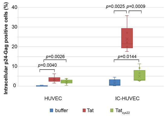 Extracellular Tat protein promotes productive Human Immunodeficiency Virus (HIV-1) infection of IC-HUVEC. HUVEC or IC-HUVEC were exposed to NL4.3 virus (p24-Gag = 70 ng/mL) in the absence or in the presence of 1 µM (10 µg/mL) of the Tat protein, either biologically active (Tat), or devoid of transactivating activity (Tatcys22). Four days later, cells were washed, trypsinized, and processed for intracellular staining for p24-Gag antigen. Box-plot data obtained from three independent experiments and analyzed by the Wilcoxon Two-sample Test are shown. Dots indicate individual measures.