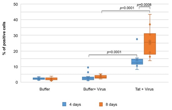 Extracellular Tat protein promotes productive HIV-1 infection of IC-HUVEC. IC-HUVEC were exposed to NL4.3 virus (p24-Gag = 70 ng/mL) in the absence or in the presence of 10 µg/mL of biologically active Tat protein (Tat). Four and 8 days later, cells were washed, trypsinized, and processed for intracellular staining for p24-Gag antigen. Box–plot of data obtained from five independent experiments and analyzed by the Wilcoxon Two-sample Test are shown. Dots indicate individual measures.