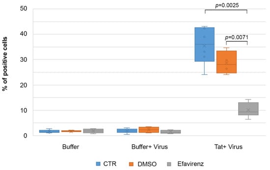 Efavirenz blocks HIV-1 productive infection of IC-HUVEC promoted by extracellular Tat protein. IC-HUVEC were pre-treated with Efavirenz (500 nM) or its resuspension buffer (0.005% DMSO) for 1 h prior to virus infection; then, they were exposed in the presence of the drug to NL4.3 virus (p24-Gag = 70 ng/mL), in the absence or in the presence of 10 µg/mL of biologically active Tat protein (Tat). Four days later, cells were washed, trypsinized, and processed for intracellular staining for p24-Gag antigen. Box-plot of data obtained from three independent experiments and analyzed by the Wilcoxon Two-sample Test are shown. Dots indicate individual measures.