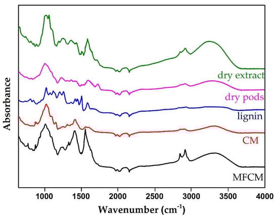 The FTIR spectra for CM, MFCM, and lignin was recorded at room temperature using the Cary 630 FTIR Spectrometer in ATR mode (Agilent Technologies Inc., Santa Clara, CA, USA) and Agilent MicroLab Software FTIR System (Agilent Technologies, Inc., USA). The chosen measurement range was 4000–650 cm−1, number of scans was 400, and resolution was 4 cm−1. The FTIR spectra of dry extract were produced on the alcoholic extract of G. tricanthos leaves dried previously in an oven at 35 °C (for 24 h).