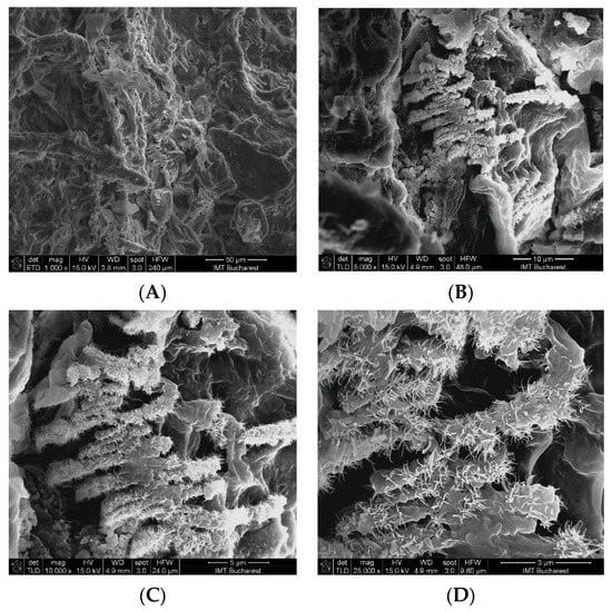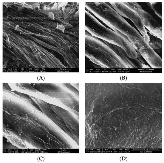 SEM morphology of the reference CM surface obtained from Gleditsia triacanthos pods, used for functionalization with active principles from G. triacanthos leaves: (A) 1000×, (B) 5000×, (C) 10,000×, and (D) 20,000×.