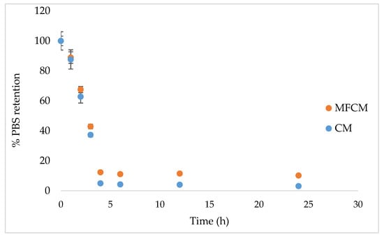 The difference in terms of water retention capacity (PBS) between the CM (control) and MFCM remained constant after 4 h, however, MFCM had better water retention properties (Figure 4).