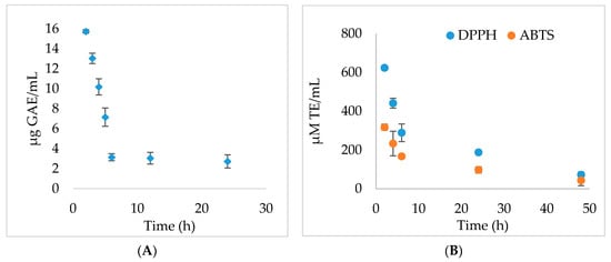 The TEAC (Trolox equivalent antioxidant capacity) results have shown that the highest concentration of compounds with antioxidant potential was released in the first 6 h [], while in the DPPH (1,1-diphenyl-2-picrylhydrazyl radical) assay, the antioxidant activity was inversely proportional to the contact time, observing a constant release until the complete reduction of the phenolic compound content in the material (Figure 5B).