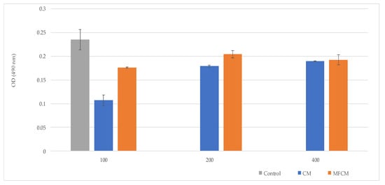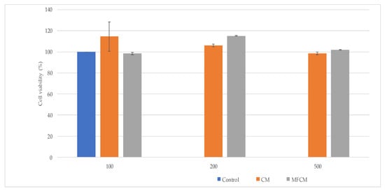 Cell viability (%) investigated by MTT ([3-(4,5-dimethylthiazol-2yl)]-2,5-diphenyltetrazolium bromide) assay—L929 cells co-cultured with CM and MFCM at various concentrations: 100, 200, and 500 µg/µL.