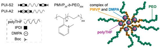 Proposed structure of a surfactant–copolymer complex co-assembled from a sequence-controlled symmetric polyurethane ionomer (PUI-S2) or asymmetric PUI (PUI-A2) (chemical structures in Figure A1) with double hydrophilic diblock copolymer poly(N-methyl-2-vinylpyridinium iodide)29-b-poly(ethylene oxide)204 (PMVP29-b-PEO204). PUIs are composed of poly(tetrahydrofuran) (polyTHF), isophorone diisocyanate (IPDI), dimethylpropionic acid (DMPA), and tert-butyloxycarbonyl (Boc). The core–shell surfactant–copolymer complexes contain a core comprising the anionic PUI micelles associated with the cationic PMVP segments of the block copolymer.