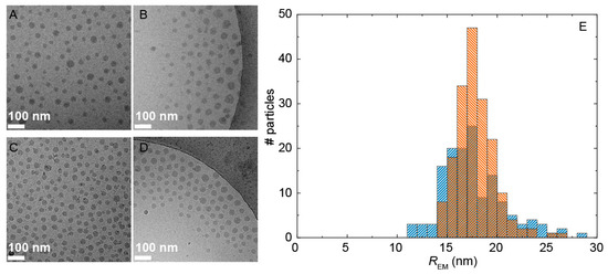 Cryogenic transmission electron microscopy (cryoTEM) experiments were performed next to visualize the complexes to examine their morphology and determine the mean dimensions of the micellar core (the corona was generally invisible due to its low contrast). We attempted to increase the core contrast by staining with uranyl acetate. However, we found no significant difference between stained and unstained samples (see for example Figure 3A vs. Figure 3B). As expected, spherical structures were observed in the electron micrographs of both systems (Figure 3). Interestingly, for both PUI-A2:PMVP29-b-PEO204 (Figure 3A,B) and PUI-S2:PMVP29-b-PEO204 (Figure 3C,D) we measured an average radius, REM, of 18 nm (Figure 3E). This gave a shell thickness, defined as the difference between Rh and REM, of 10 and 8 nm for complexes with PUI-S2 and PUI-A2, respectively. The core of both mixed micellar complexes was thus considerably larger than the corona. CryoTEM further revealed a high similarity in the size distributions of the micellar cores (Figure 3E), from which we computed a modest core dispersity ÐEM = 0.11 (PUI-S2) and 0.18 (PUI-A2).