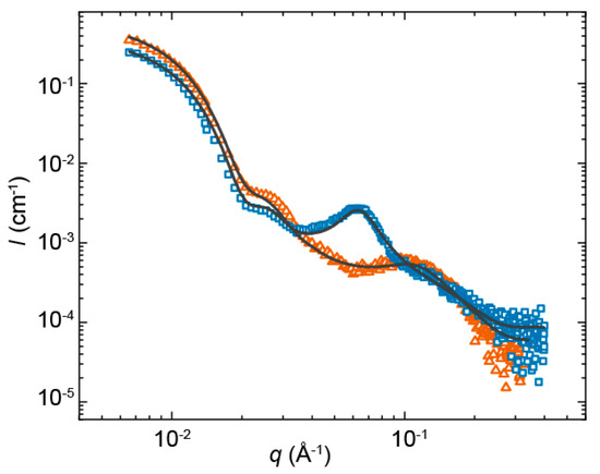 Measured small-angle X-ray scattering (SAXS) profiles of PUI-S2:PMVP29-b-PEO204 (open triangle, orange) and PUI-A2:PMVP29-b-PEO204 (solid square, blue), and computed models (solid line).