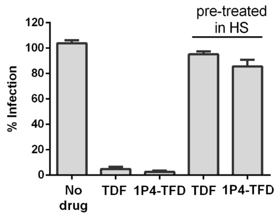 TDF was shown previously to lose its antiviral potency on in vitro exposure to human plasma and serum [48]. We therefore decided to assess whether TFD adducts are as susceptible to biodegradation as TDF. For this reason, in vitro anti-HIV activity of the compounds was assessed in MT-4 cells using a 5-day infectivity assay, with pretreatment in the growth medium (standard conditions) or 100% human serum (HS) to mimic plasma exposure. As shown in Figure 5, TDF and 1P4-TFD adduct were equally susceptible to HS-induced degradation, whereas, under standard conditions, the antiviral activity was retained. Thus, substituting mPEG-b-PEPA for fumaric acid failed to protect TFD from cleavage by esterases present in human plasma and serum.