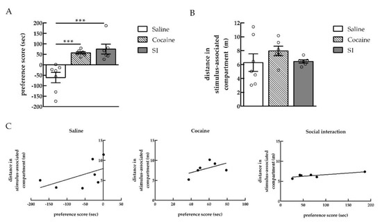 Cocaine and social interaction produced similar rewarding effects. (A) Conditioned place preference score after saline, cocaine, or social interaction (SI) conditioning (n = 6–7). (B) Distance traveled in the stimulus-associated compartment during the conditioned place preference (CPP) test (n = 6–7). (C) Correlation between conditioned place preference score and distance traveled in the stimulus-associated compartment during the test in saline, cocaine, and SI CPP groups (n = 6–7). *** p < 0.001, different from the saline CPP group, using a one-way ANOVA followed by Newman-Keuls multiple comparisons test.