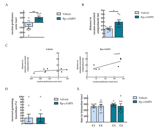 In order to investigate the effects of intra-NAc inhibition of PKA on cocaine and SI CPP expression, we infused the cAMP analog Rp-cAMPS in the NAc of rats conditioned to both cocaine and social interaction in a concurrent CPP paradigm. As expected [14,17], rats conditioned simultaneously with cocaine in one compartment and SI in the other compartment expressed no preference for cocaine (Figure 3A). However, PKA inhibition in the NAc shifted the preference toward cocaine as compared to the vehicle group [two tailed unpaired t-test, ** p < 0.01 (p = 0.0036), t = 3.54, df = 13; Cohen’s d = −1.87; n = 7–8] (Figure 3A). The infusion of Rp-cAMPS also increased the locomotor activity of the rats in the cocaine-paired compartment when compared to the vehicle group [two tailed unpaired t-test with Welch’s correction, * p < 0.05 (p = 0.0227), t = 2.87, df = 7.404; Cohen’s d = −1.49; n = 7–8] (Figure 3B). Furthermore, this distance was positively correlated with cocaine preference after infusion with Rp-cAMPS in the NAc [Pearson correlation coefficient; vehicle (n = 8): r = 0.41, p = 0.3128 (ns); Rp-cAMPS (n = 7): r = 0.77, p = 0.0437 (*)] (Figure 3C).