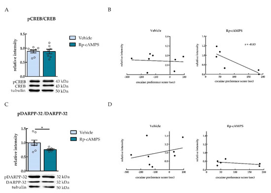 Infusions of Rp-cAMPS reduced levels of pDARPP-32 in the NAc. (A,C) Relative intensity of (A) phosphorylated CREB (pCREB) and (C) phosphorylated DARPP-32 (pDARPP-32) in the NAc of animals infused with either vehicle or the PKA inhibitor Rp-cAMPS (n = 6–8). Representative Western blot images are shown below the graphs. (B,D) Correlation between cocaine preference score and relative intensity of pCREB (B) and pDARPP-32 (D) in the nucleus accumbens of vehicle and Rp-cAMPS-infused animals (n = 6–8). * p < 0.05, using an unpaired t-test with Welch’s correction, different from vehicle.