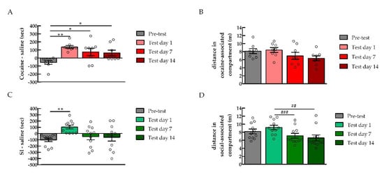 As previously shown [14], cocaine CPP can persist up to several days after the last conditioning session. A significant preference for the cocaine-paired compartment was observed in rats subjected to cocaine CPP [Repeated measures one-way ANOVA, test day effect, F = 7.703; p = 0.0046, n = 8]. On test day 1, rats conditioned to cocaine demonstrated a strong preference for the stimulus-associated compartment [Pre-test vs. Test day 1 (n = 8), ** p < 0.01, Cohen´s d = −3.28] as shown by the difference between the time animals spent in the cocaine-paired compartment and the time they spent in the saline-associated compartment. This preference persisted on test day 7 [Pre-test vs. Test day 7 (n = 8), * p < 0.05, Cohen´s d = −1.29] and test day 14 [Pre-test vs. Test day 14 (n = 8), * p < 0.05, Cohen´s d = 1.39] (Figure 6A). The locomotor activity of the animals in the cocaine-paired compartment was not different between the test days (Figure 6B). In another set of experiments, other rats were conditioned to social interaction and, on test day 1, a significant preference for the SI-paired compartment was observed [Repeated measures one-way ANOVA, test day effect, F = 5.258; p = 0.0159; n = 11; Pre-test (n = 11) vs. Test day 1 (n = 11) ** p < 0.01, Cohen´s d = −2.20]. Contrary to cocaine CPP, when tested on day 7 after the first test, the initial preference of these rats for the SI-associated compartment was not expressed anymore [Pre-test vs. Test day 7 (n = 11), p > 0.05]. The same effect was observed on test day 14 [Pre-test vs. Test day 14 (n = 11), p > 0.05] (Figure 6C). Rats conditioned to social interaction showed a decrease in the locomotor activity associated with the social-compartment during test day 7 and test day 14 compared to test day 1 [Repeated measures one-way ANOVA, test day effect, F = 12.33; p = 0.0005; n = 11; Test day 1 vs. Test day 7, ### p < 0.001, Cohen´s d = 1; Test day 1 vs. Test day 14, ## p < 0.01, Cohen´s d = 0.78; Test day 7 vs. Test day 14, p > 0.05] (Figure 6D).