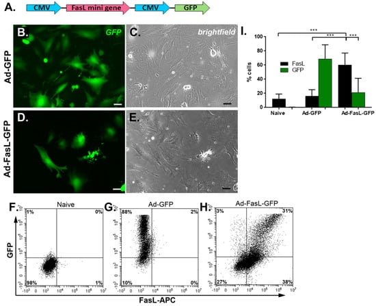 The transduction of MSC with Ad-FasL-GFP adenovirus-resulted in the overexpression of FasL. (A) A scheme depicting the vector used for the expression of the FasL protein coded by FasL truncated gene under the CMV promotor. Representative fluorescence (right) and brightfield (left) images of MSC transduced with an empty vector (Ad-GFP) (B,C) and FasL (Ad-FasL-GFP) (D,E) 48 h after transduction. Scale bar is 100 µm. Flow cytometry dot plots of naïve (F), Ad-GFP- (G) and Ad-FasL-GFP-transduced MSC (H). (I) Graph depicting the percentage of cells that express FasL in naïve, Ad-GFP- and Ad-FasL-GFP-transduced MSC 48 h after transduction. Data are means ± SD. *** p < 0.0005 by one-way ANOVA.
