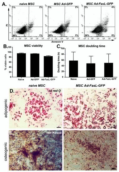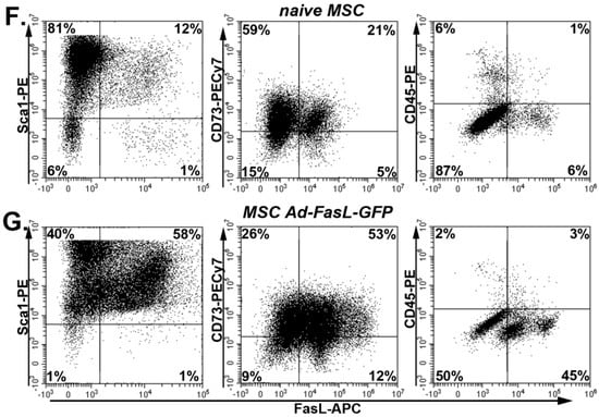 Second, the quantification of the doubling time of MSC in culture showed a negligible effect of either GFP or FasL expression, which was around 50 h (Figure 2C). Therefore, the transduction of MSC and overexpression of GFP and FasL did not induce significant apoptosis or attenuated the cell cycle rates. Third, MSC transduced to express FasL retained the potential to differentiate and adopt adipogenic and osteogenic phenotypes similar to naïve MSC (Figure 2D,E). Fourth, the presence of specific markers was monitored by flow cytometry, showing a prevalent expression of Sca1 (96% ± 4%), CD44 (~97%), CD105 (~92%) and CD73 (78% ± 3%) and the absence of c-kit (~0.6%) and CD45 (4% ± 4%) in naïve MSC grown in culture for 5–9 passages (Figure S2A–F and Figure 2F). Following the transduction with Ad-FasL-GFP, the levels of expression were 98% for Sca-1 and 79% for CD73, respectively, and was ~5% for CD45 expression (Figure 2G). Thus, the cell transduction and expression of GFP and FasL did not significantly change the MSC phenotype.