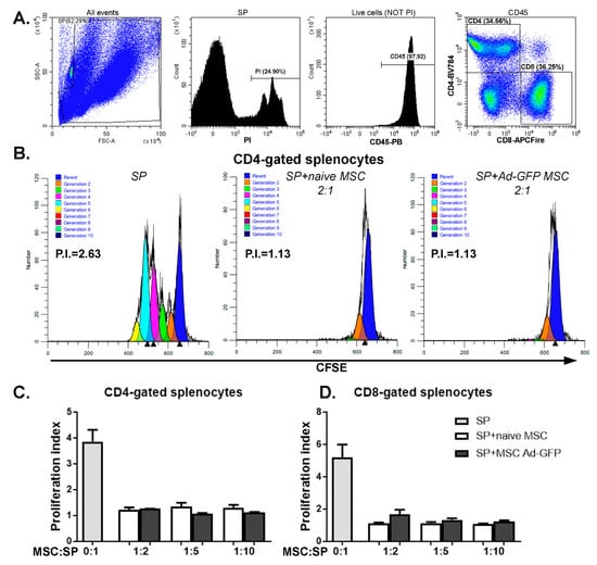 MSC transduced with Ad-GFP displayed immunomodulatory properties. (A) Gating strategy for assessing the proliferation of CFSE)-stained viable CD45CD4 and CD45CD8-activated splenocytes (SP). Proliferating CFSE-labeled cells were stained with PI and anti-CD45, -CD4 and CD8 antibodies. Splenocytes were gated out from the mix of cells and CD3/CD28 T cells activating beads to eliminate the beads from the analysis. Next, within the viable CD45-positive cell (negative for PI) population, CD4 and CD8-positive cells were determined. These populations were analyzed based on CFSE staining using ModFit software. (B) Representative ModFit proliferation plots of CD4-gated splenocytes that were cultured alone (SP), with naïve MSC (SP + naïve MSC) and with Ad-GFP-transduced MSC (SP + MSC Ad-GFP) in a ratio of 1:2 MSC to splenocytes. Graphs depicting the proliferation index of CD4- (C) and CD8-gated splenocytes (D) grown in the absence or presence of naïve MSC or MSC transduced with Ad-GFP for 72 h while stimulated with CD3/CD28 T cell activation beads.