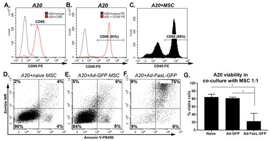MSC overexpressing FasL induced a robust apoptosis of A20 cells. Expression of CD95 (A) and CD45 (B) in A20 cells by flow cytometry. (C) Gating on the CD45+ A20 cells in cocultures with MSC. (D) Apoptosis and death of gated A20 cells, as determined from Zombie NIR and Annexin V uptake after 24 h of coculture with naïve (D) and Ad-GFP- (E) and Ad-FasL-GFP-transduced MSC (F) at an A20:MSC ratio of 1:1. (G) Summary of A20 cell viability after a coculture with naïve and transduced MSC. Data are means ± SD (n = 2). * p < 0.05 by one-way ANOVA.