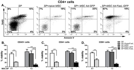 MSC overexpressing FasL induced the death of CD4 and CD8 T cells. (A) Freshly harvested splenocytes were activated with CD3/CD28 beads and cultured with or without adenovirus-infected MSC. After 72 h, the viability of different populations of splenocytes (CD45, CD4 and CD8) was determined. Representative dot plots of CD4-positive-activated splenocytes were cultured for 72 h in the absence (SP) or in the presence of naïve MSC (SP + naïve MSC), MSC transduced with Ad-GFP (SP + MSC Ad-GFP) and MSC transduced with Ad-FasL-GFP (SP + MSC Ad-FasL-GFP) at the ratio of 1:2 MSC to splenocytes and stained with 7-Aminoactinomycin D (7AAD) and Annexin V. Graphical representation of the data that shows the percentage of viable cells within the CD45 (B), CD45CD4 (C) and CD45CD8 (D)-positive cells, respectively. Data are means ± SD (n ≥ 3), *** p < 0.0005 by one-way ANOVA.