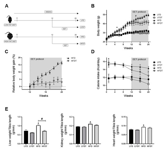 Delayed endurance exercise training (EET) prevents body weight gain and organ hypertrophy induced by HFD in mice. (A) Schematic representation of experimental design. Obesity in mice was induced with 12 weeks on a high-fat diet (HFD). Control mice were fed with a low-fat diet (LFD). Mice were subsequently divided in sedentary or trained groups on a treadmill for eight additional weeks (LFD, LFDT, HFD, HFDT). (B) Body weight evolution throughout the experimental protocol (20 weeks). Statistical analyses were performed by two-way ANOVA followed by Newman–Keuls post hoc test. (C) Relative body weight gain in HFD vs. HFDT mice during EET protocol normalized with body weight at week 12. The slope was determined with simple linear regression analysis. n = 10 in each group. (D) Calorie intake evolution throughout the experimental protocol. Number of calories consumed per day calculated for each mouse at different time-point (at week 1, 4, 8, 12, 16 and 20 of the experimental protocol). Statistical analyses were performed by two-way ANOVA followed by Newman–Keuls post hoc test. (E) Organ weights at week 20. Statistical analyses were performed by one-way ANOVA followed by Newman–Keuls post hoc test. Data are presented as means ± SEM. * p ≤ 0.05 versus LFD # p ≤ 0.05 versus HFD. n = 10 in each group.