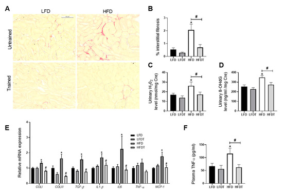 Obesity-induced chronic kidney disease is also characterized by an increased tubulo-interstitial fibrosis, inflammation and oxidative stress in HFD mice. To decipher the impact of EET on these key characteristics of the pathological progression, collagen I and III depositions were studied by morphometric analysis in Sirius red-stained renal sections as an index of the fibrotic response. As illustrated in Figure 4A, collagen accumulated in the interstitium of HFD mice. This observation was confirmed by the quantitative analysis of Sirius Red positive staining (Figure 4B). EET treatment significantly reduced collagen I and III deposition. Candidate genes expression involved in renal fibrosis (TGF-β1, collagen type I and III) and inflammation (TNFα, IL-1β, IL-6 and MCP-1) were also measured by real-time qPCR. As observed in Figure 4E, renal mRNA levels of the profibrotic markers were all significantly decreased with EET in mice fed a HFD as well as for the pro-inflammatory markers in HFD mice. These changes were prevented by EET. The plasma TNFα concentration for systemic inflammation was also evaluated and the data reported an increased concentration of this proinflammatory cytokine in HFD mice that was significantly reduced with exercise. As markers of oxidative stress, the urinary hydrogen peroxide and 8-hydroxy-2’-deoxyguanosine (8-OHdG) levels were measured at week 20. These markers were both significantly higher in HFD mice compared to LFD mice (Figure 4C,D). The increase in urine hydrogen peroxide and 8-OHdG were also prevented by EET. The results demonstrate that EET reduces renal injuries by decreasing oxidative stress, fibrosis and inflammation in obese mice.