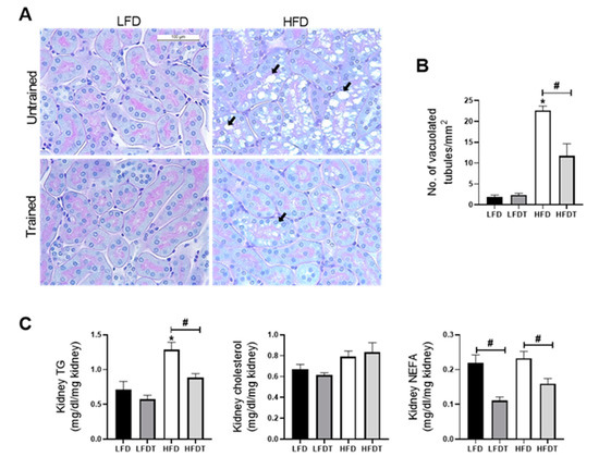 - Muller, C.R.; Americo, A.L.V.; Fiorino, P.; Evangelista, F.S. Aerobic exercise training prevents kidney lipid deposition in mice fed a cafeteria diet. Life Sci. 2018, 211, 140–146. [Google Scholar] [CrossRef]
