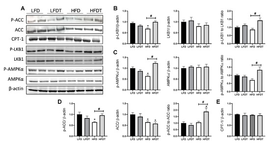 Delayed EET restores AMPK activity in the kidney of HFD mice. (A) Western Blot analysis of phosphor-LKB1, LKB1, phospho-AMPK, AMPK, phospho-ACC, ACC and CPT-1 in kidney tissue from mice on LFD, LFDT, HFD and HFDT at week 20. (B) Relative densitometry of the immunoblots representing, respectively, phospho-LKB1 protein level normalized with β-actin, LKB1 protein level normalized with β-actin and phospho-LKB1 to LKB1 ratio. (C) Relative densitometry of the immunoblots representing, respectively, phospho-AMPK protein level normalized with β-actin, AMPK protein level normalized with β-actin and phospho-AMPK to AMPK ratio. (D) Relative densitometry of the immunoblots representing, respectively, phospho-ACC protein level normalized with β-actin, ACC protein level normalized with β-actin and phospho-ACC to ACC ratio. (E) Relative densitometry of the immunoblots representing CPT-1 protein level normalized with β-actin. Statistical analyses were performed by one-way ANOVA followed by Newman–Keuls post hoc test. Data are presented as means ± SEM. * p ≤ 0.05 versus LFD # p ≤ 0.05 versus HFD. n = 6–8 in each group.