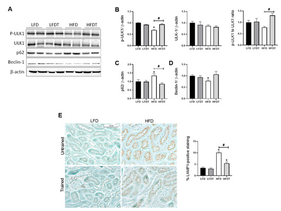 Effects of a delayed EET on autophagy and lysosomal markers in the kidney from mice on LFD or HFD. (A) Western Blot analysis of phospho-ULK-1 (Ser 555), ULK-1, p62 and Beclin-1 in kidney tissue from mice LFD, LFDT, HFD and HFDT. (B) Relative densitometry of the immunoblots representing, respectively, phosphor-ULK1 (Ser 555) protein level normalized with β-actin, ULK-1 protein level normalized with β-actin and Phospho-ULK1 (Ser 555) to ULK-1 ratio. (C) Relative densitometry of the immunoblots representing p62 protein level normalized with β-actin. (D) Relative densitometry of the immunoblots representing Beclin-1 protein level normalized with β-actin. (E) Representative photomicrograph (original magnification ×400; scale bar: 100 µm) showing lysosomal-associated membrane protein 1 (LAMP1)–positive staining on intracellular vacuoles and related quantitative analysis of LAMP1-positive staining. Statistical analyses were performed by one-way ANOVA followed by Newman–Keuls post hoc test. Data are presented as means ± SEM. * p ≤ 0.05 versus LFD # p ≤ 0.05 versus HFD. n = 6–8 in each group.