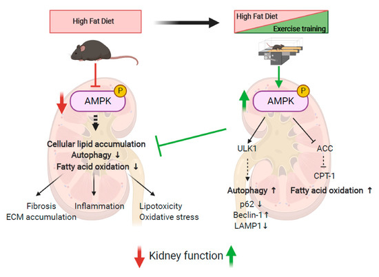 Despite considerable efforts in the development of new therapeutic strategies, there is still a lack of effective treatment without strong side effects. Current pharmacotherapies that target food intake regulation have side effects (psychiatric and/or cardiovascular side effects) observed for long periods of use and may be associated with weight regain once the medication is stopped [20]. In addition, even though AMPK has been demonstrated to represent a key target for the treatment of metabolic diseases, indirect AMPK activators such as AICAR (5-Aminoimidazole-4-carboxamide ribonucleotide) have been widely investigated during the last decade by our group and others but did not demonstrate adequate and efficient therapeutic effects in clinical use [21]. The ongoing development of direct and specific AMPK activators thus represents an important pharmacological challenge [22]. This highlights the urgent need for alternative therapeutic strategies. Recently, the study of the effects of behavioral interventions such as exercise training in obesity-related diseases has regained interest. Indeed, targeting key pathways that could mediate beneficial effects by exercise represents a safer alternative therapeutic approach for the treatment of chronic metabolic disorders. Exercise training has been shown to exert beneficial outcomes in managing obesity-associated diseases [23,24]. However, there is still a lack of knowledge about the underlying mechanisms. Moreover, the efficacy of exercise-based therapeutic approach in patients presenting CKD remains controversial, mainly due to the experiment biases of the clinical studies regarding exercise training in obese patients with CKD [25,26,27,28].