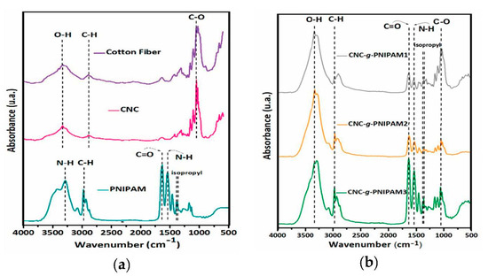 Infrared spectra of (a) cotton fibers, CNCs, and PNIPAM; (b) CNC-g-PNIPAM1, CNC-g-PNIPAM2, and CNC-g-PNIPAM3.