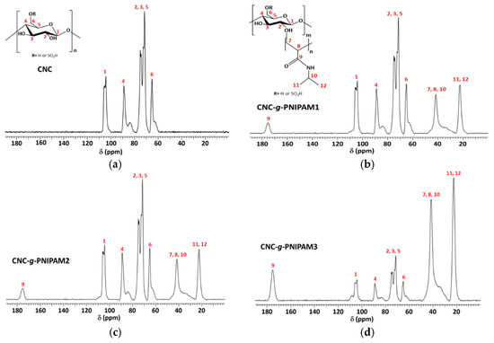 13C NMR spectra of (a) CNC; (b) CNC-g-PNIPAM1; (c) CNC-g-PNIPAM2; (d) CNC-g-PNIPAM3.