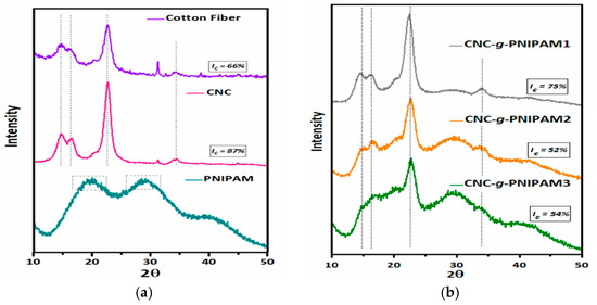 X-ray diffractograms of (a) cotton fibers (CF), cellulose nanocrystals (CNCs), and PNIPAM; (b) CNC-g-PNIPAM1, CNC-g-PNIPAM2, and CNC-g-PNIPAM3.