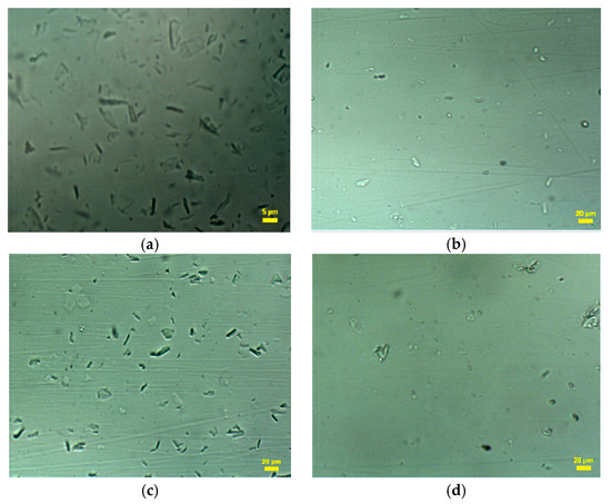 The hydrodynamic diameters of the particles obtained from dynamic light scattering (DLS) measurements are also presented in Table 1 and in the Supplementary Materials (Figures S2 and S3). The small increase in the mean size of the filtered particles from CNCs to modified CNCs agrees with the change from bare to polymer-decorated nanocrystals [23]. In addition, to estimate the mean size of the particles after dispersion in the drilling fluid, the CNC-g-PNIPAM copolymers were added to distilled water and stirred at 20,000 rpm (the same as used for fluid preparation) and analyzed without a filtration step. The values were compared to the size of the particles dispersed by gentler magnetic stirring at 250 rpm (also without filtration). Although larger than the filtered particles, the mean size of the copolymers was much smaller when they were subjected to a high stirring speed, indicating disaggregation of the particles.
