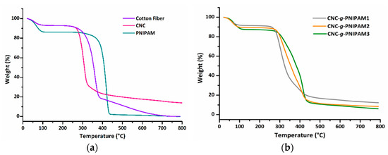 Thermogravimetric curves of (a) cotton fibers (CFs), cellulose nanocrystals (CNCs), and PNIPAM; (b) CNC-g-PNIPAM1, CNC-g-PNIPAM2, and CNC-g-PNIPAM3.