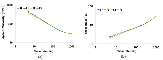(a) Viscosity curves and (b) flow curves of the SF, F1, F2, and F3 drilling fluids.