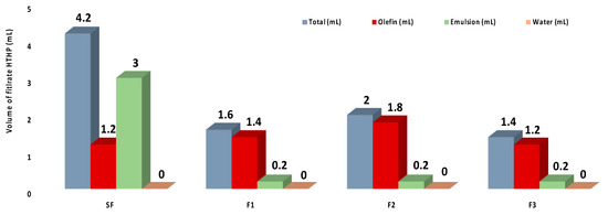 The invasion of the liquid phase of the fluid (filtrate) into the rock formation must be controlled to avoid damage to oil- and gas-producing zones. During drilling, a filter cake is formed on the face by the components of the fluid, which can control fluids loss. Figure 7 shows the volume of the filtrate of the olefin-based drilling fluids after HTHP filtration. All the fluids produced with a small amount of CNC-g-PNIPAM presented much lower filtration loss than the standard fluid. No significant difference between F1, F2, and F3 filtrate loss was measured, and a minimal emulsion (0.2 mL) was found on the filtrate. It is assumed that the presence of modified cellulose nanocrystals can lead to a better closing of fluid penetration channels, leading to a thinner, impermeable filter cake and, subsequently, an improvement in the filtration properties [32,33,34,35].